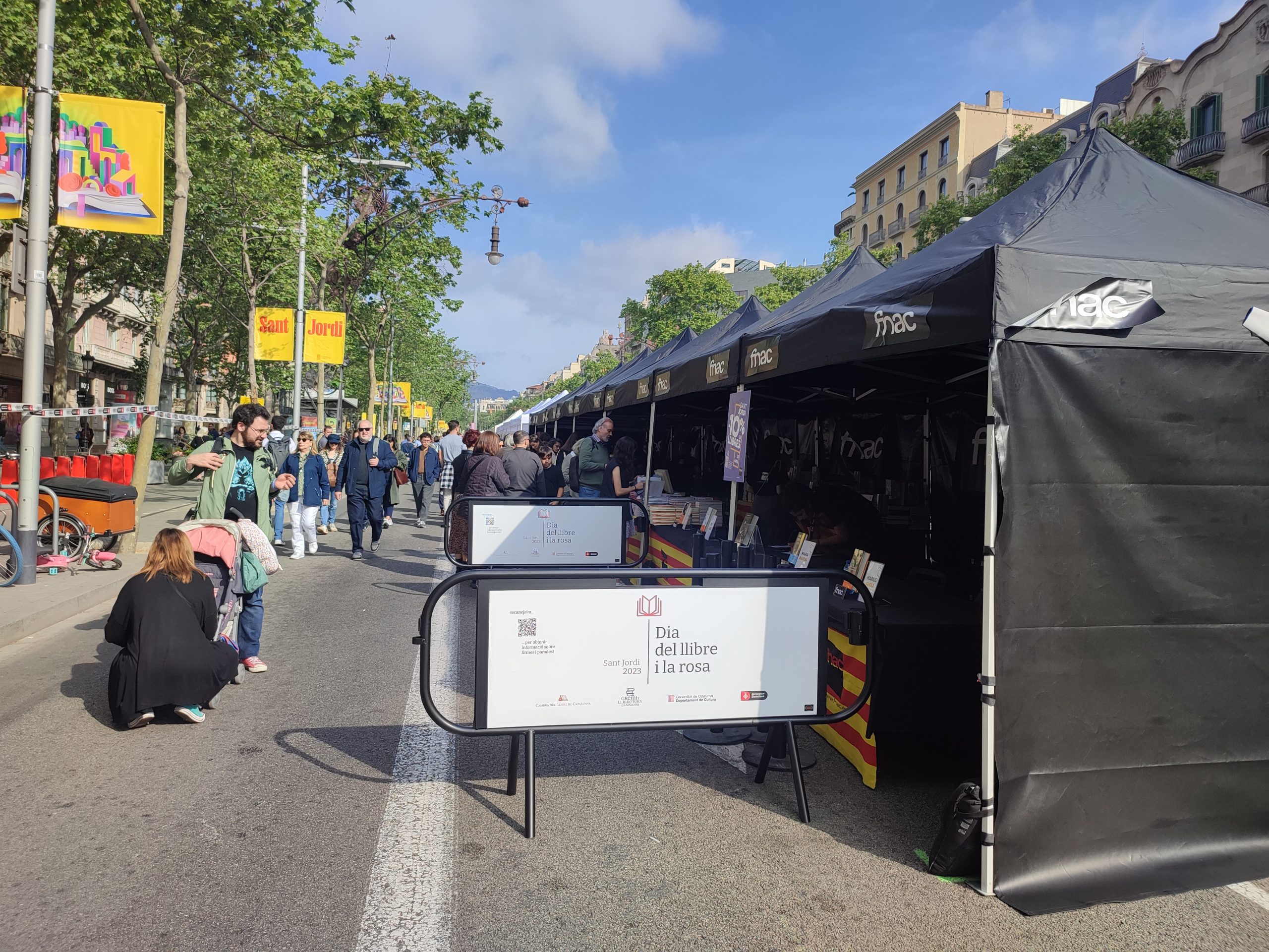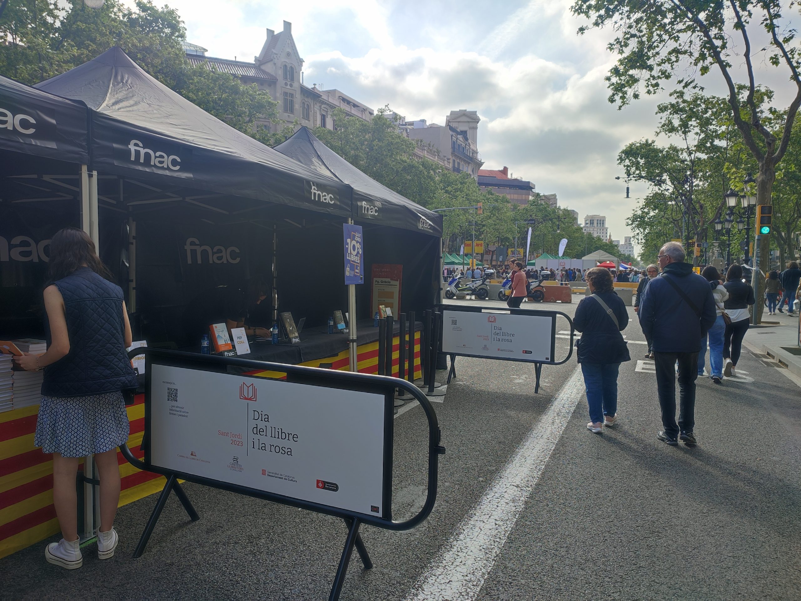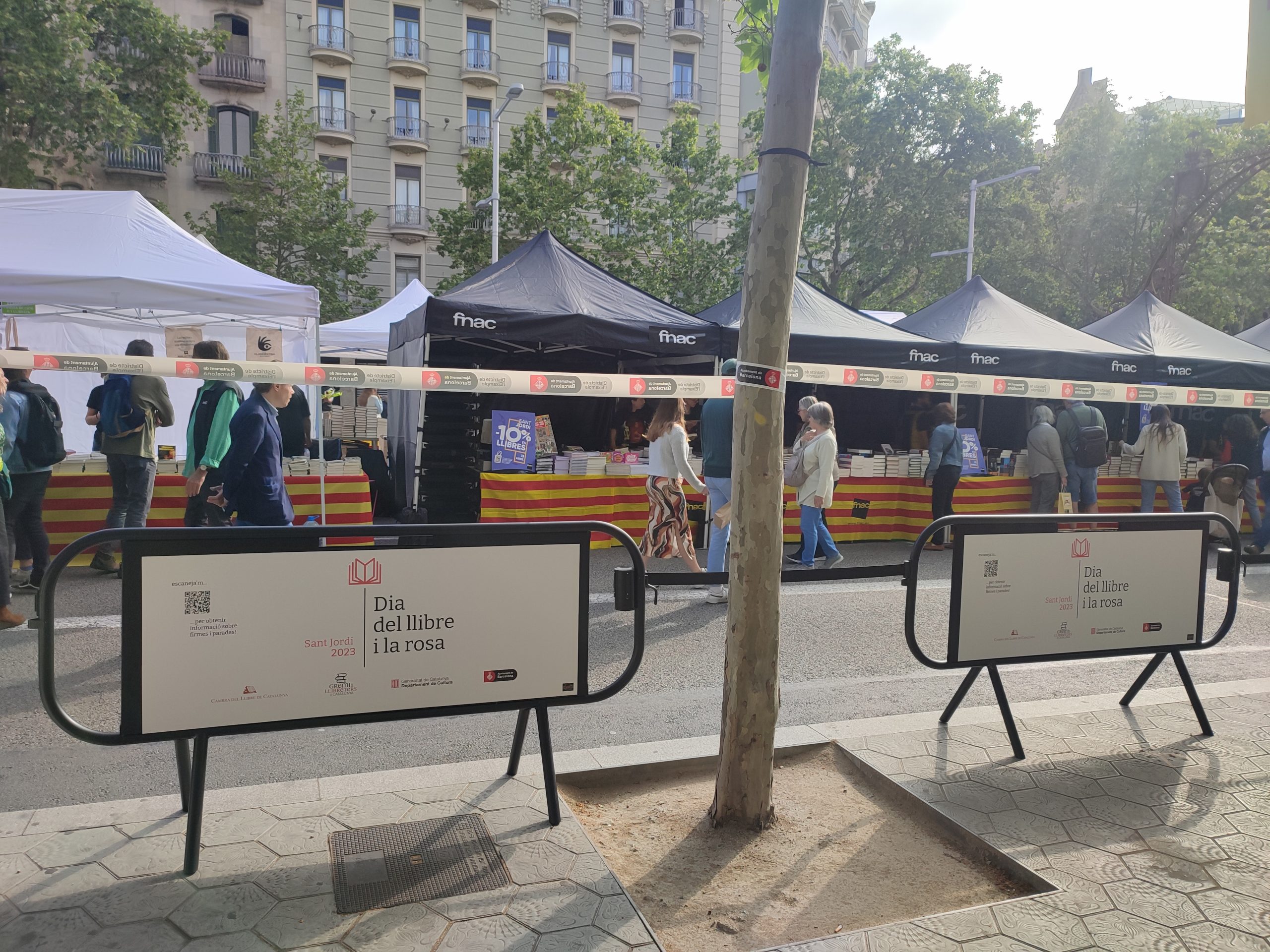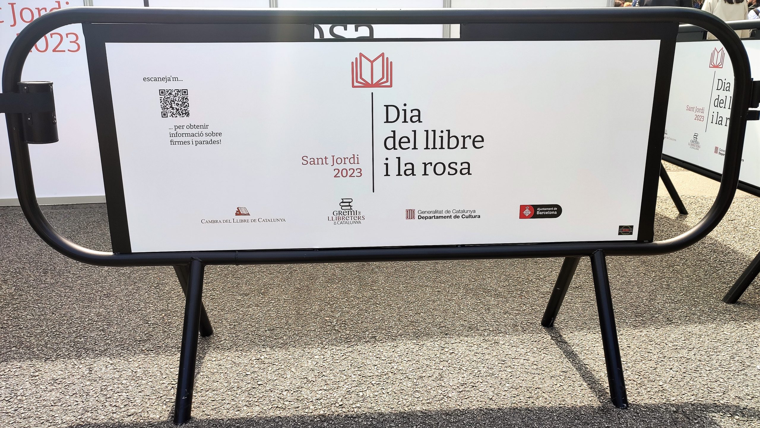 Alquiler de vallas para la delimitación de espacios y alquiler de vallas negras personalizadas con catenaria para la canalización de colas para las firmas de autores en el evento de Sant Jordi 2023 de Barcelona.