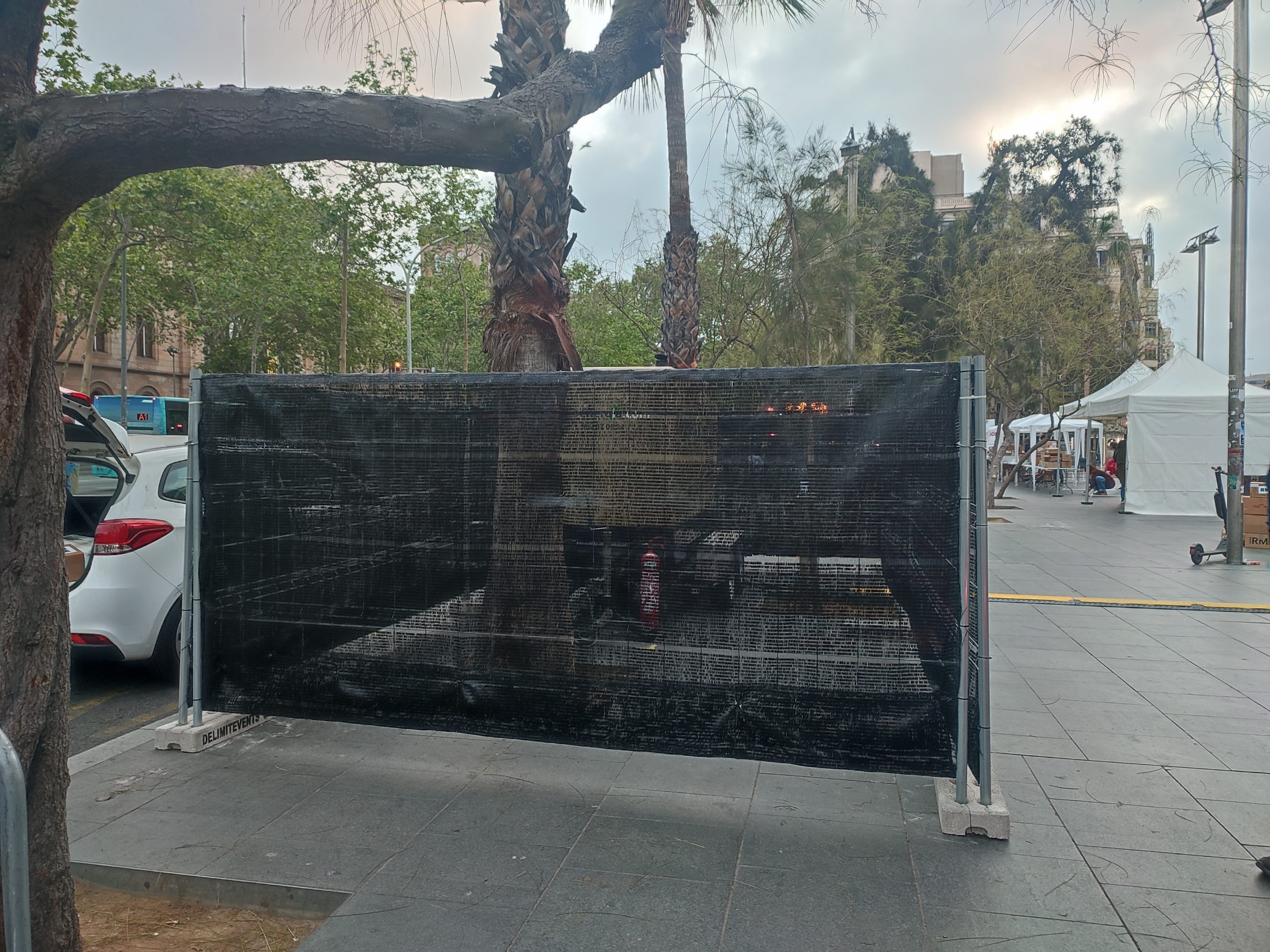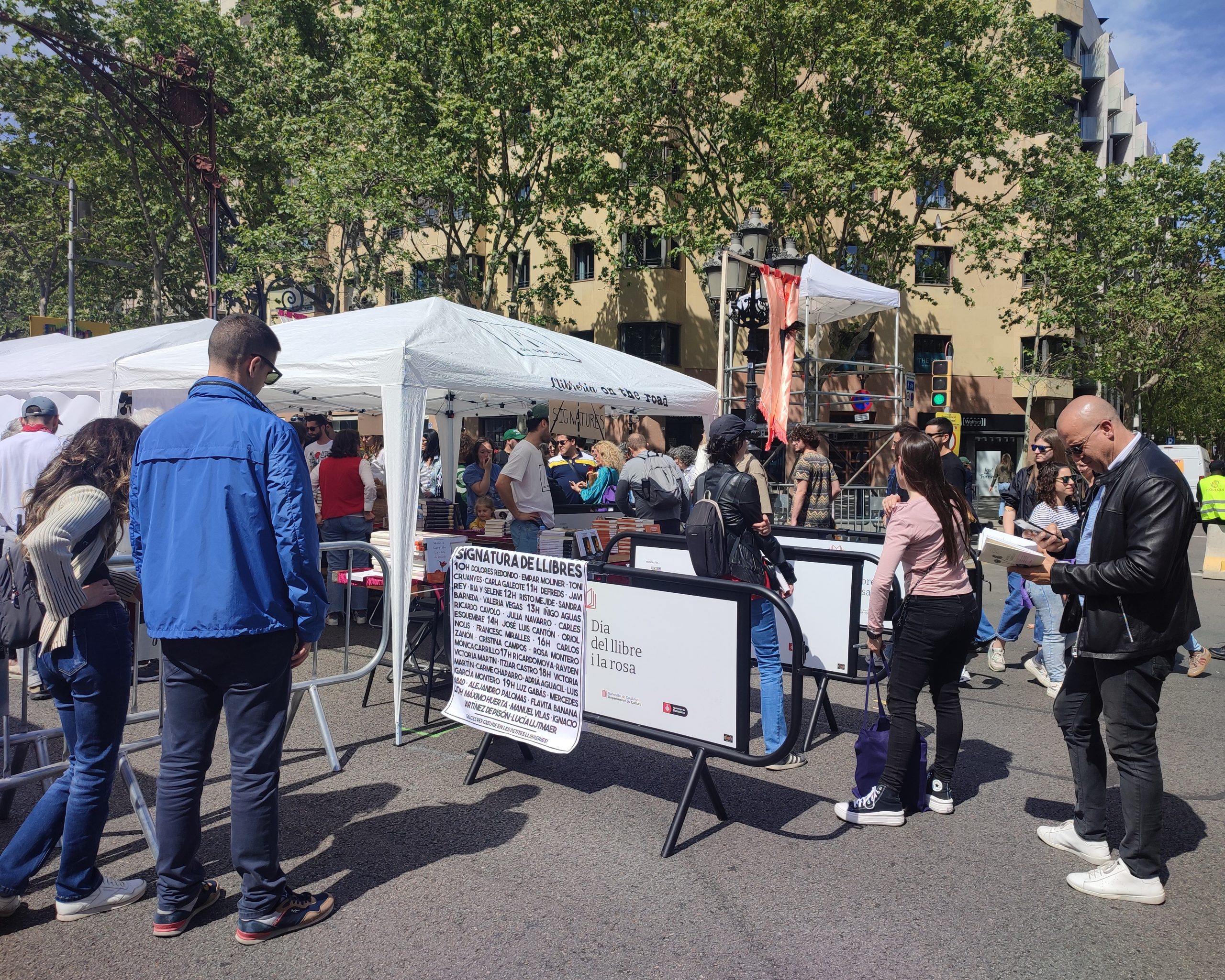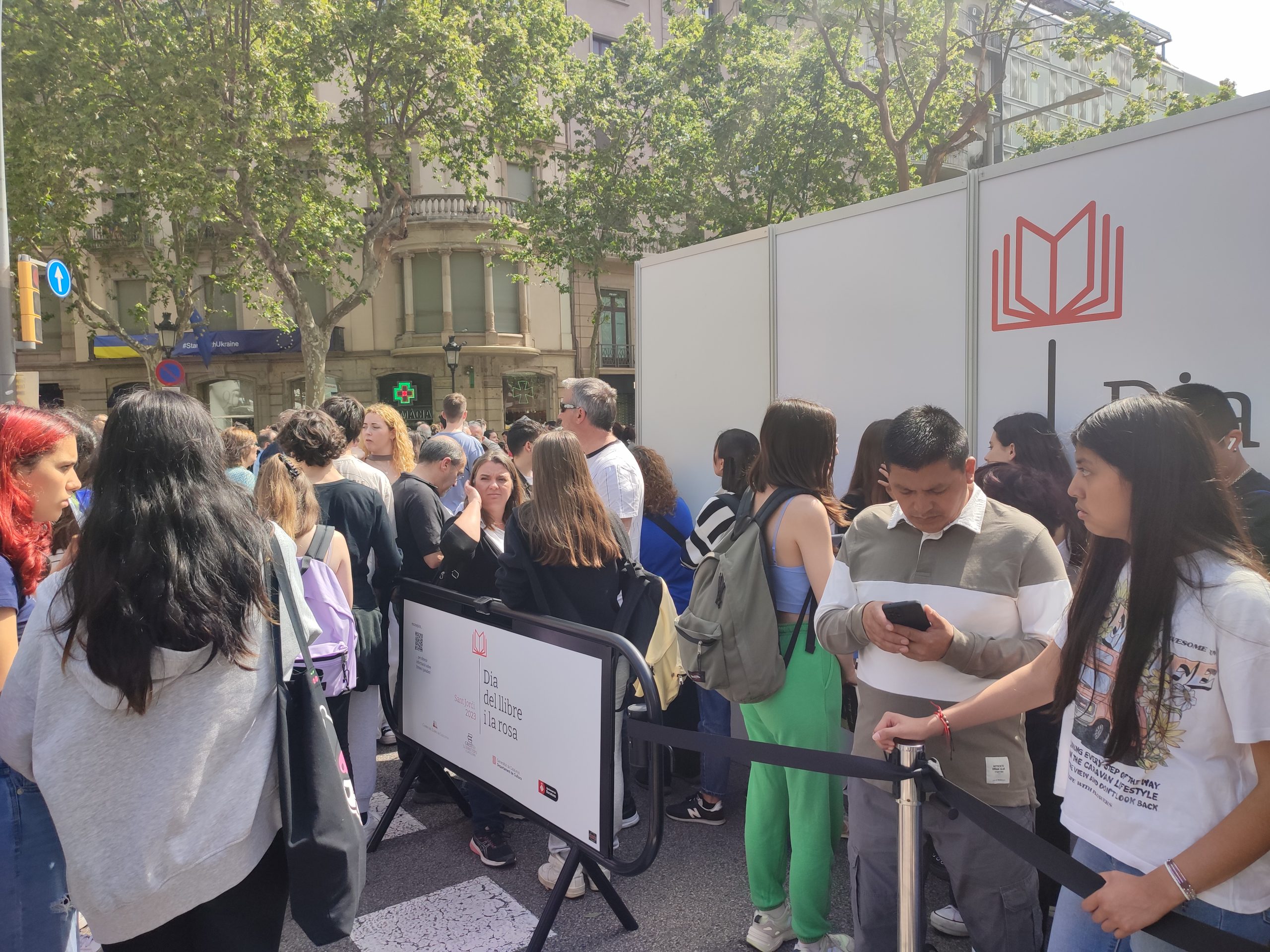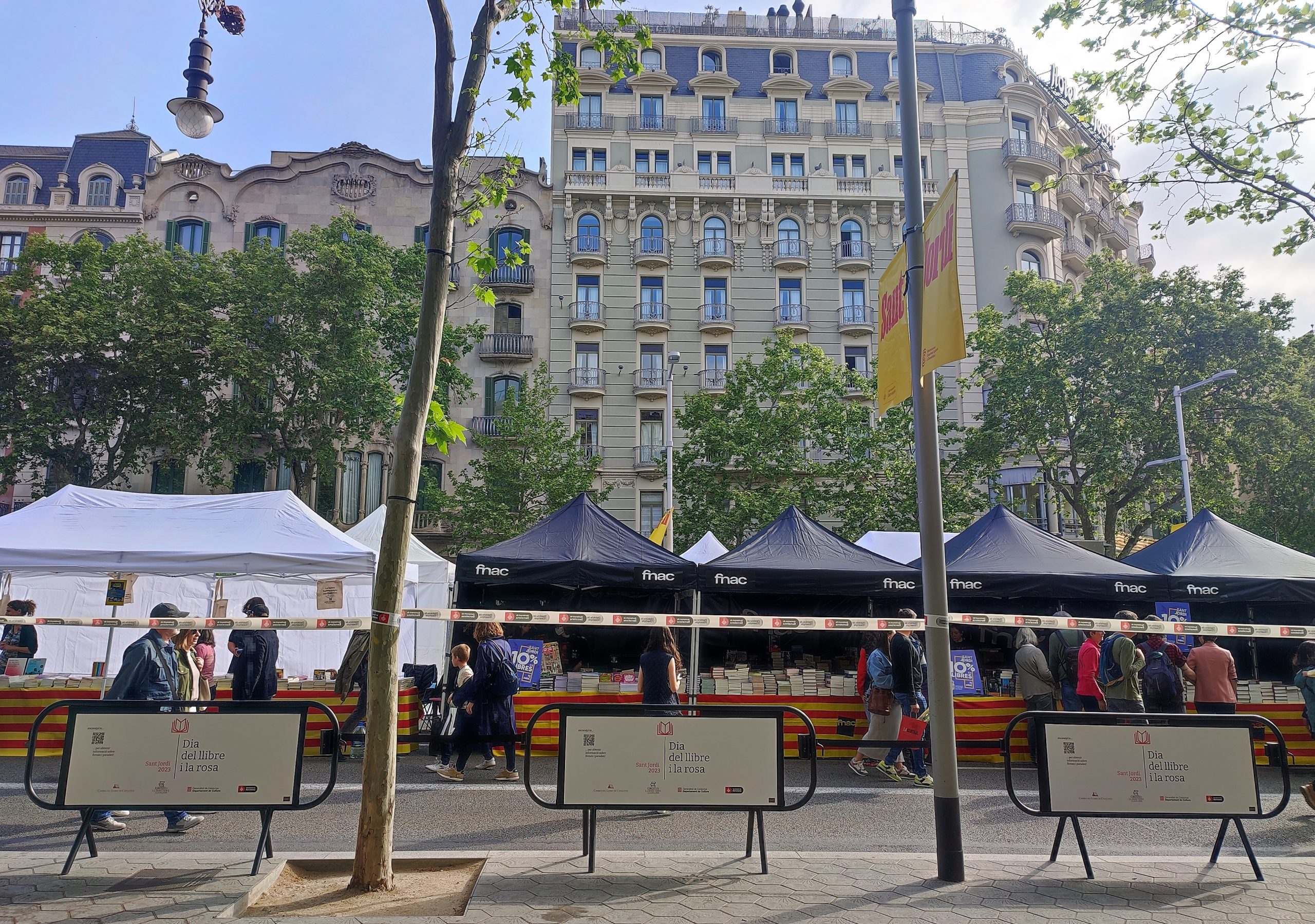 Alquiler de vallas para la delimitación de espacios y alquiler de vallas negras personalizadas con catenaria para la canalización de colas para las firmas de autores en el evento de Sant Jordi 2023 de Barcelona.